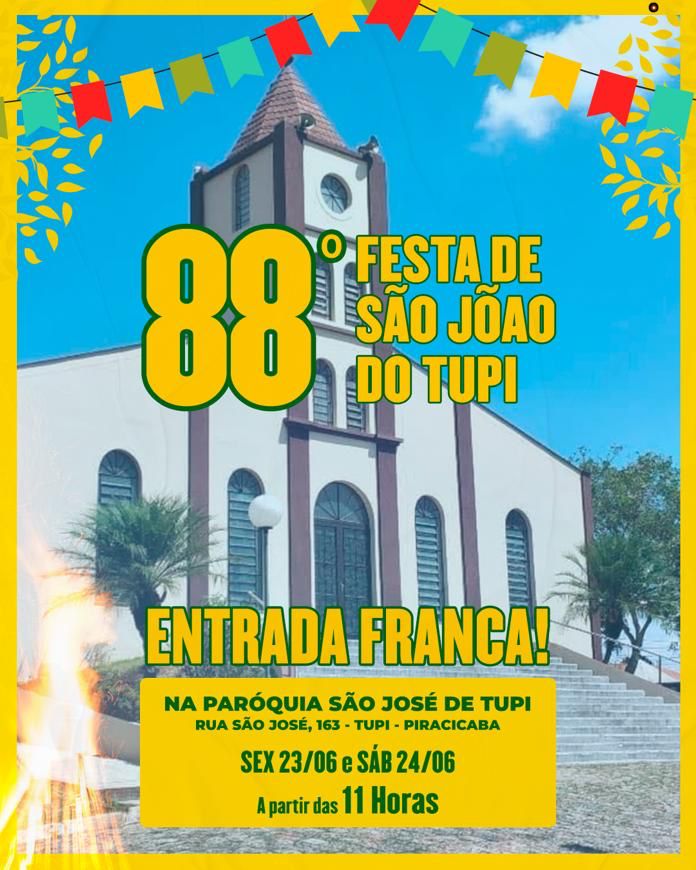 O distrito de Tupi, em Piracicaba, cidade do interior do Estado de São Paulo, está literalmente em festa! Após um período de três anos sem a tradicional Festa de São João do Tupi, em razão da pandemia, o evento vai acontecer neste final de semana, na Paróquia São José de Tupi, com entrada franca, e com novidades. Além do tradicional dia 23 de junho, nesta edição, a festa também vai acontecer no dia 24 de junho.