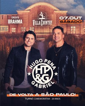 Já está tudo pronto para o primeiro reencontro da dupla Hugo Pena & Gabriel com os fãs da capital paulista. Após mais de dez anos seguindo em carreiras solo, os artistas sobem juntos ao palco do Villa Country, maior casa sertaneja da América Latina, no dia 07 de outubro de 2023 (sábado), apresentando no repertório sucessos que marcaram época, como “Vou Te Amar”, “Estrela”, “Robin Hood da Paixão” e “Mala Pronta” (sucesso e trilha sonora da novela “A Favorita” da TV Globo em 2008), entre outros hits. Os ingressos já estão à venda pelo site e na bilheteria do local.