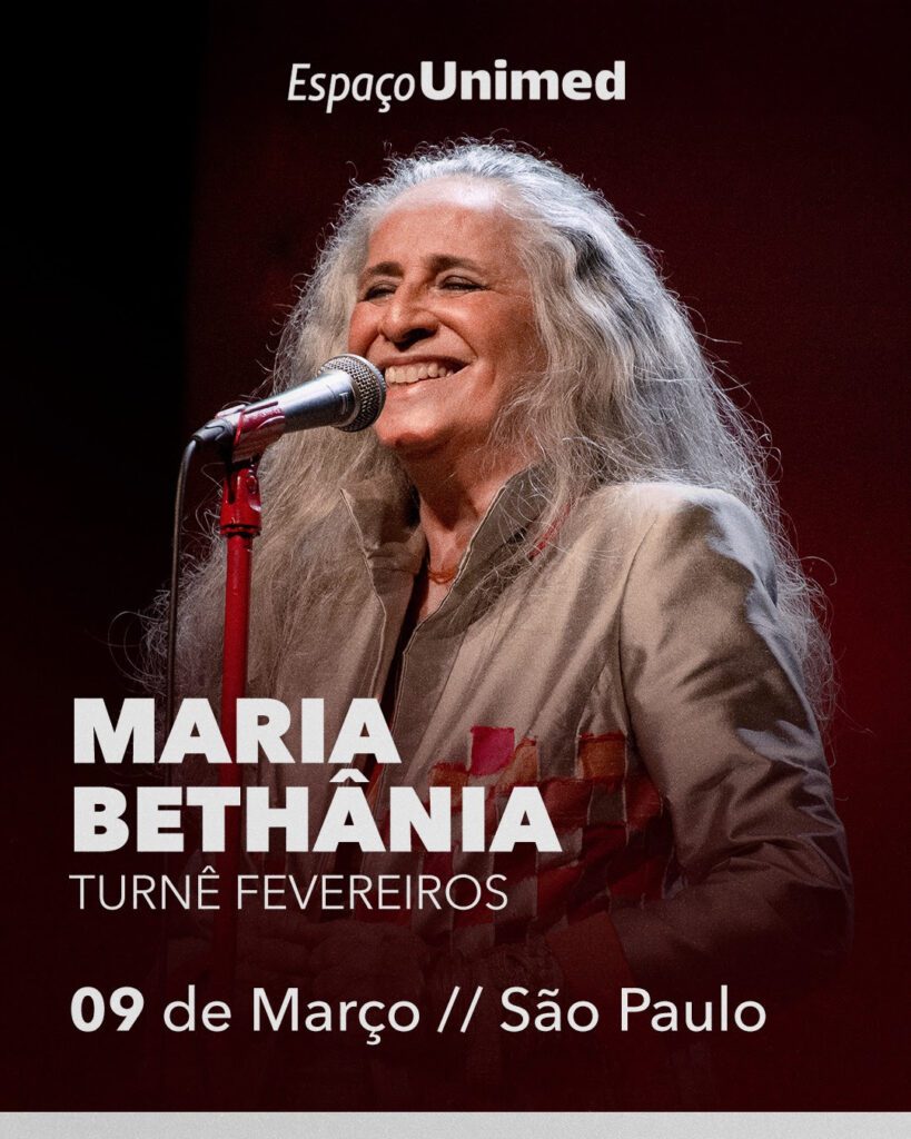 Depois de percorrer as grandes capitais brasileiras e se apresentar na Europa, Maria Bethânia sobe no palco do Espaço Unimed em São Paulo, no dia 9 de março de 2024, sábado, para realizar o show que encerra a turnê “Fevereiros”.