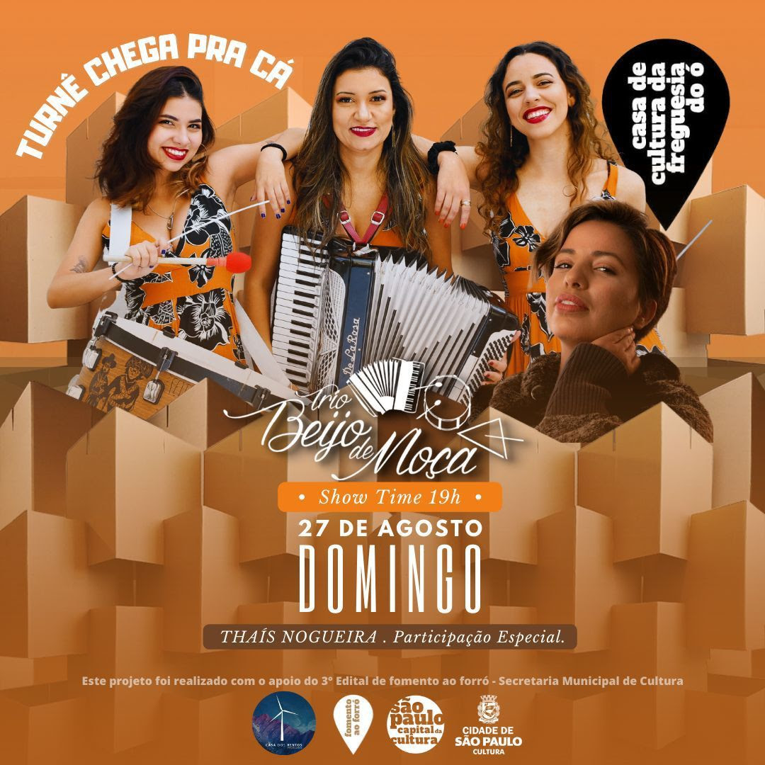 Após o grande sucesso da primeira apresentação, o Trio Beijo de Moça traz o segundo show da Turnê “Chega Pra Cá”, que será realizado domingo, dia 27/08 na Casa de Cultura Freguesia do Ó, a partir das 19h.