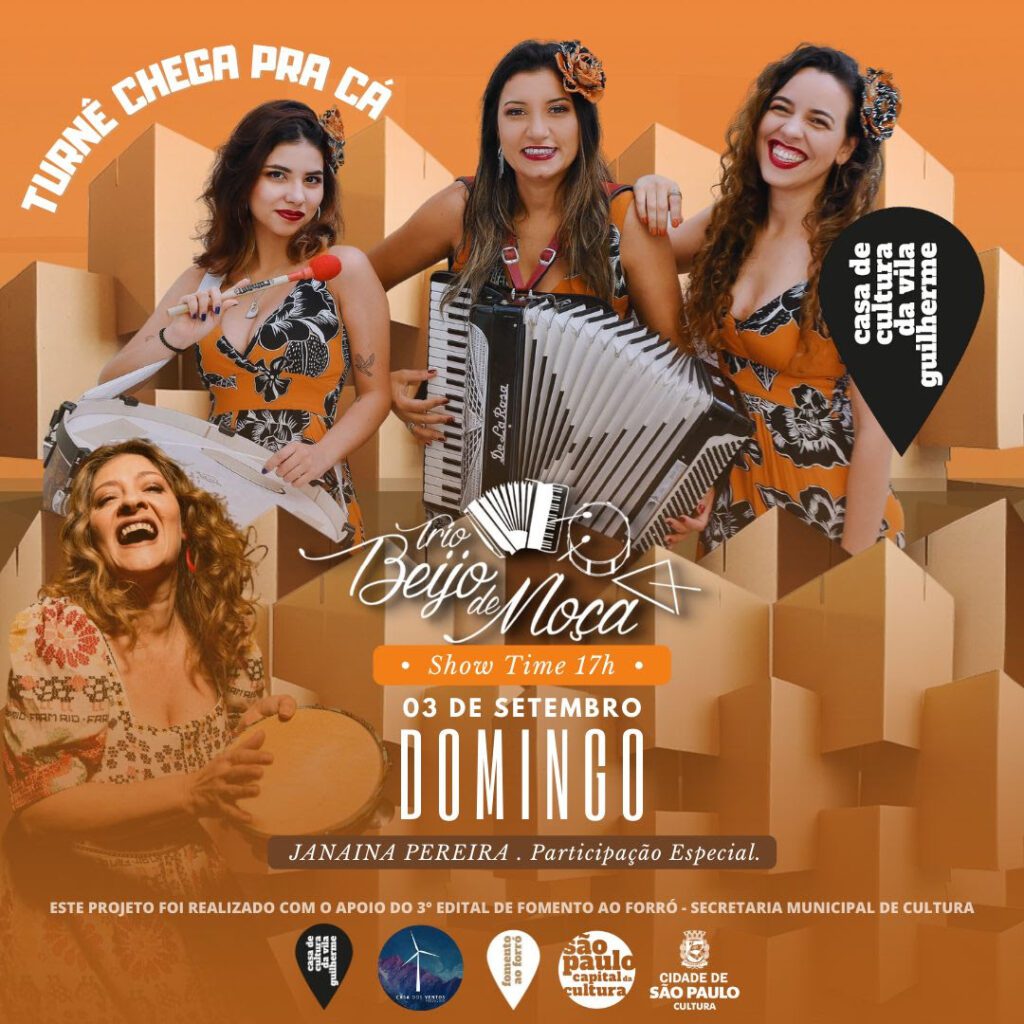 Com um forró diversificado e da melhor qualidade, o Trio Beijo de Moça realiza o terceiro show da nova turnê “Chega Pra Cá”. A apresentação acontece neste domingo, dia 03 de setembro, a partir das 17h no Casarão Vila Guilherme, em São Paulo. Neste evento, a novidade é a presença especial da cantora e compositora Janayna Pereira, ex vocalista da banda “Bicho de Pé” e autora do grande sucesso “Nosso Xote”.