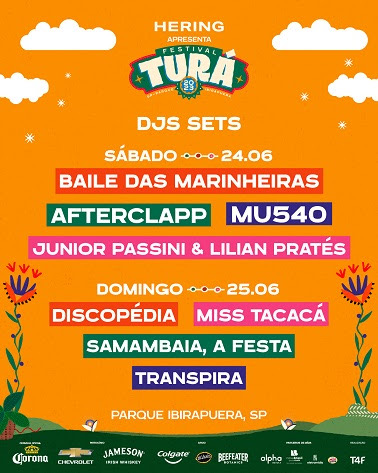 Marcado para os dias 24 e 25 de junho, na área externa do Auditório Ibirapuera, no Parque Ibirapuera, o festival Turá completa todos os ingredientes que serão responsáveis por fazer da sua segunda edição uma imersão pela várias sonoridades e sabores que compõem a cultura brasileira. Após a programação de shows ser revelada, agora é a vez de anunciar o line-up de DJs. No dia 24 de junho (sábado),a discotecagem fica por conta do Baile das Marinheiras, After Clapp, DJ Mu540 e Junior Passini & Lilian Prates (nesta data, as apresentações confirmadas são: Bloco Pagu, Jorge Ben Jor, Zeca Pagodinho, Lucas Mamede, MC Hariel e Maria Rita convidando Sandra de Sá). Já no dia 25 de junho (domingo), os sets ficam por conta de:Discopédia, Miss Tacacá, Samambaia, a festa e Transpira, que dividirão o dia com Bloco Charanga do França, Pittycom o show da turnê Admirável Chip Novo e convidandoCéu e Marcelo D2, Gilberto Gil & Família – com o espetáculo “Nós, A Gente” —, DELACRUZ convidando BK’ e Luccas Carlos; Joelma convidando Mariana Aydar; e a banda Tuyo. Idealizado pela TIME FOR FUN e patrocinado pela Hering, o Turá ainda tem ingressos disponíveis — na modalidade “individual” (para um dia de evento) e passaporte (para dois dias de evento) — no site (ticketsforfun.com.br – com taxa) ou na bilheteria oficial no Teatro Renault (Av. Brigadeiro Luís Antônio, 411, República – sem taxa).