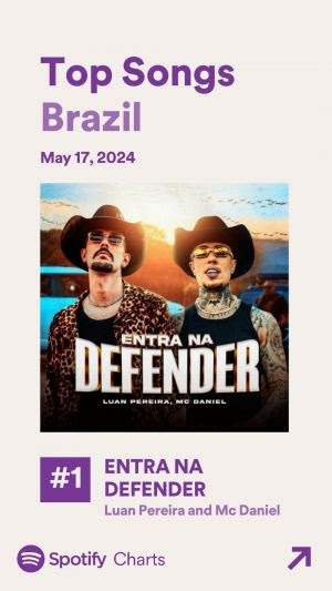 Essa é a segunda canção de Luan Pereira a alcançar o primeiro lugar na plataforma. Um dos seus maiores sucessos, “Dentro da Hilux” também ganhou o título de música mais ouvida do país no final de 2023. Desde o lançamento, em março deste ano, “Entra na Defender” figurou entre as principais músicas do Spotify. A composição do sucesso é de LP ao lado de MC Daniel, Mateus Félix e Marco Carvalho.