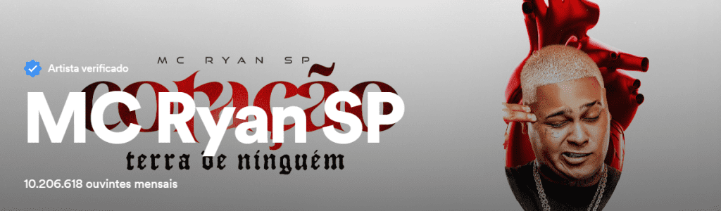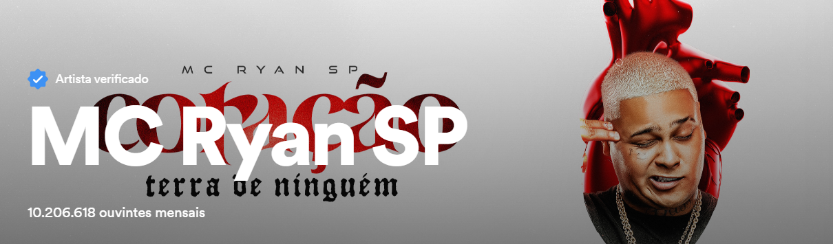 Nascido na Zona Norte de São Paulo, MC Ryan SP é um dos maiores nomes do funk da atualidade. Através de suas composições criativas, o artista cativa milhares de jovens por onde passa. Transitando por diversos estilos dentro de seu segmento, Ryan segue impulsionado pelo sucesso absoluto de “Casei com a Putaria”, e outros hits. Na noite de ontem, 20 de novembro, o cantor consagrou mais uma conquista em sua vida artística, ele tornou-se o primeiro MC a alcançar mais de 10 milhões e 206 mil ouvintes mensais em apenas uma plataforma, e também está em 3º como artista mais ouvido do Brasil, atrás apenas de Jorge e Mateus e Marília Mendonça, e em 117º no ranking mundial, e mais: o funkeiro está com 4 canções no TOP 50 Brasil do Spotify, com os singles “Casei com a Putaria” ft. Mc Paiva que está na 6º posição, “Felina” com Wiu que atingiu o 11º lugar, o remix de “Tubarão Te Amo” que consagrou-se em 12º e “Sereia” uma parceria com Orochi, Xamã, Oruam, Neo Beats e Kizzy, que está na décima quarta posição.