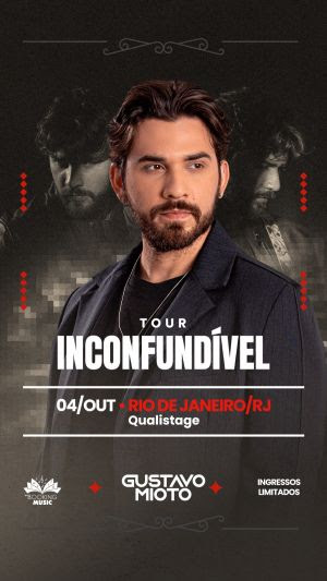Gustavo Mioto apresenta ao público carioca, pela primeira vez, o espetáculo de sua turnê “Inconfundível”, num show intimista e exclusivo no Qualistage, no sábado, dia 4 de outubro. A casa abrirá às 19h30, com início previsto para as 21h30. Esta é uma oportunidade única: restam os últimos ingressos para esta noite memorável.