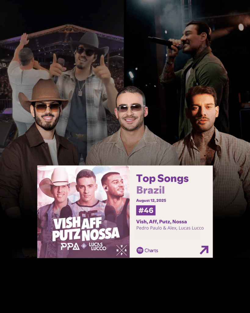 Oito anos depois, “Vish, Aff, Putz, Nossa” voltou com tudo! A parceria de Pedro Paulo & Alex com Lucas Lucco acaba de alcançar o Top 39 do Spotify Brasil, embalada por uma trend que tomou conta do TikTok. O áudio já passou das 100 mil reproduções e entrou para a lista de populares da plataforma, com participações orgânicas de nomes como Neymar, Ana Castela e Cela.